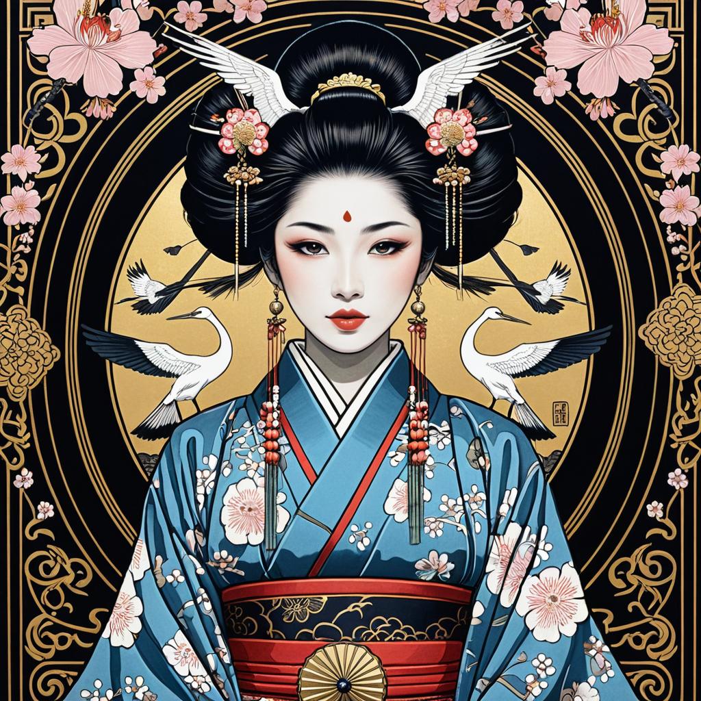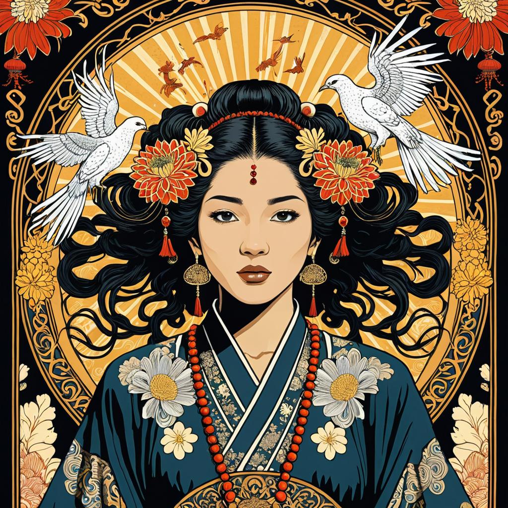 Vector graphic painting of an oriental mulatto woman with flowing black hair adorned with chrysanthemum flowers and ethnic Japanese accessories. She wears traditional ornate clothing and intricate jewelry including earrings and a red bead necklace. Two white phoenixes hover beside her against a golden art nouveau chrysanthemum frame background.