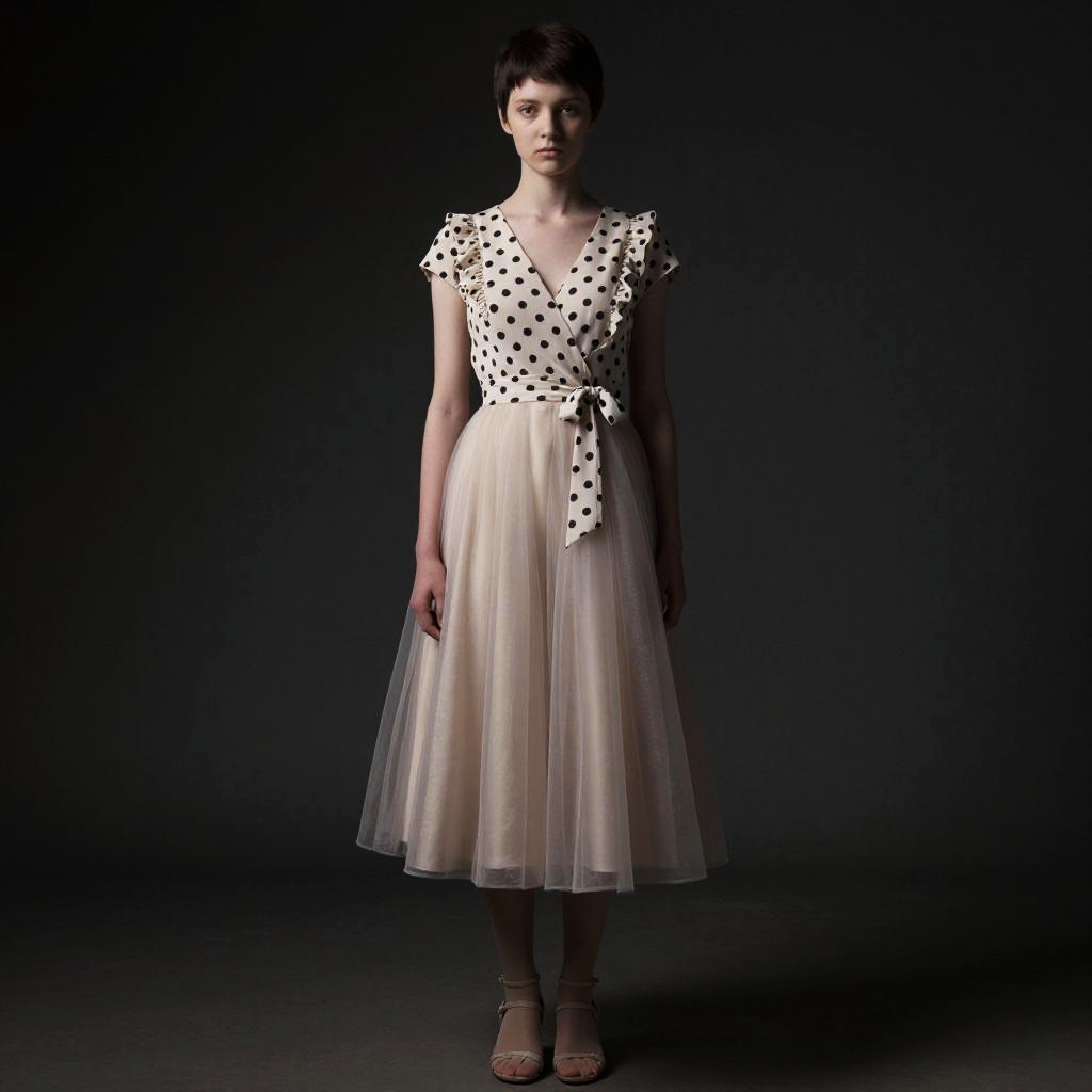 Photograph of a young woman with short brown hair, wearing a white, knee-length, polka dot dress with a bow, and sheer tulle