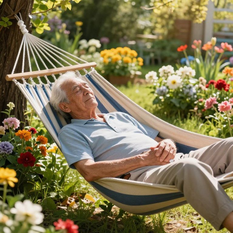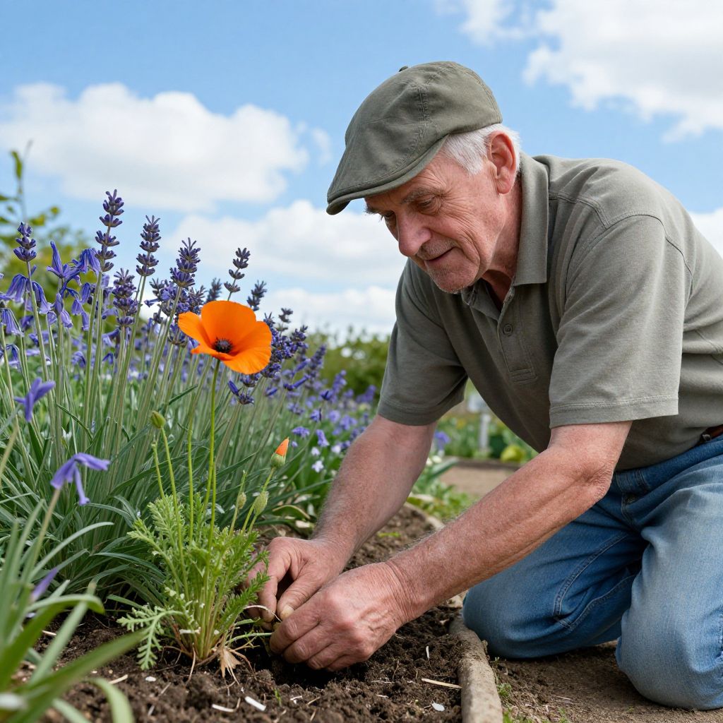 An outdoor garden scene where an orange poppy grows alongside other flowers like lavender and bluebell, under a clear blue sky with scattered clouds; a weathered old man in a green cap and jeans kneels beside the bed of soil, gently tending to the plant, showing focused interest with kind eyes and a soft expression of nostalgia.