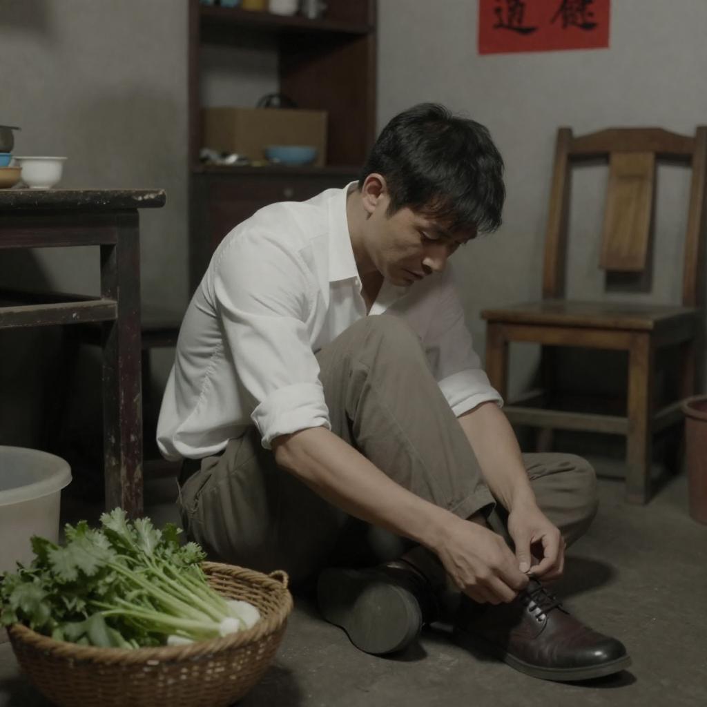 A photograph of a man in a white shirt and brown pants, sitting on the floor in a dimly lit, cluttered room. He is adjusting his pants while leaning forward. The room has a worn, rustic feel with a table, chair, and a basket of greens in the foreground. A red sign with Chinese characters is on the wall behind him.