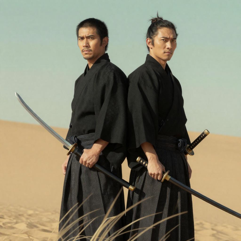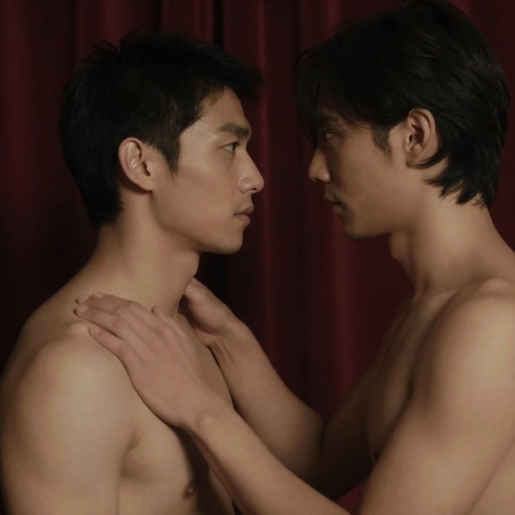Black-and-white photograph of two Japanese people outdoors. Woman with medium-length dark hair, surprised expression, wearing traditional kimono, sits beside man with messy dark hair, intense gaze, bare shoulders, draped cloth, lying on ground. Large tree trunk on left.