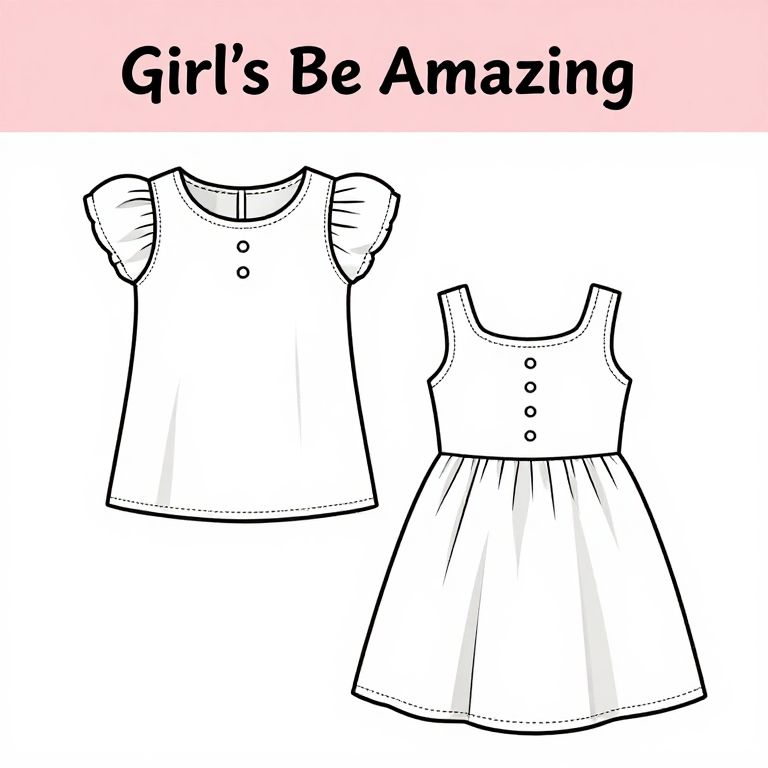 Black and white digital drawing of a girl's sleeveless dress with short puffed sleeves and buttoned front, labeled "Girl's Be Amazing" in