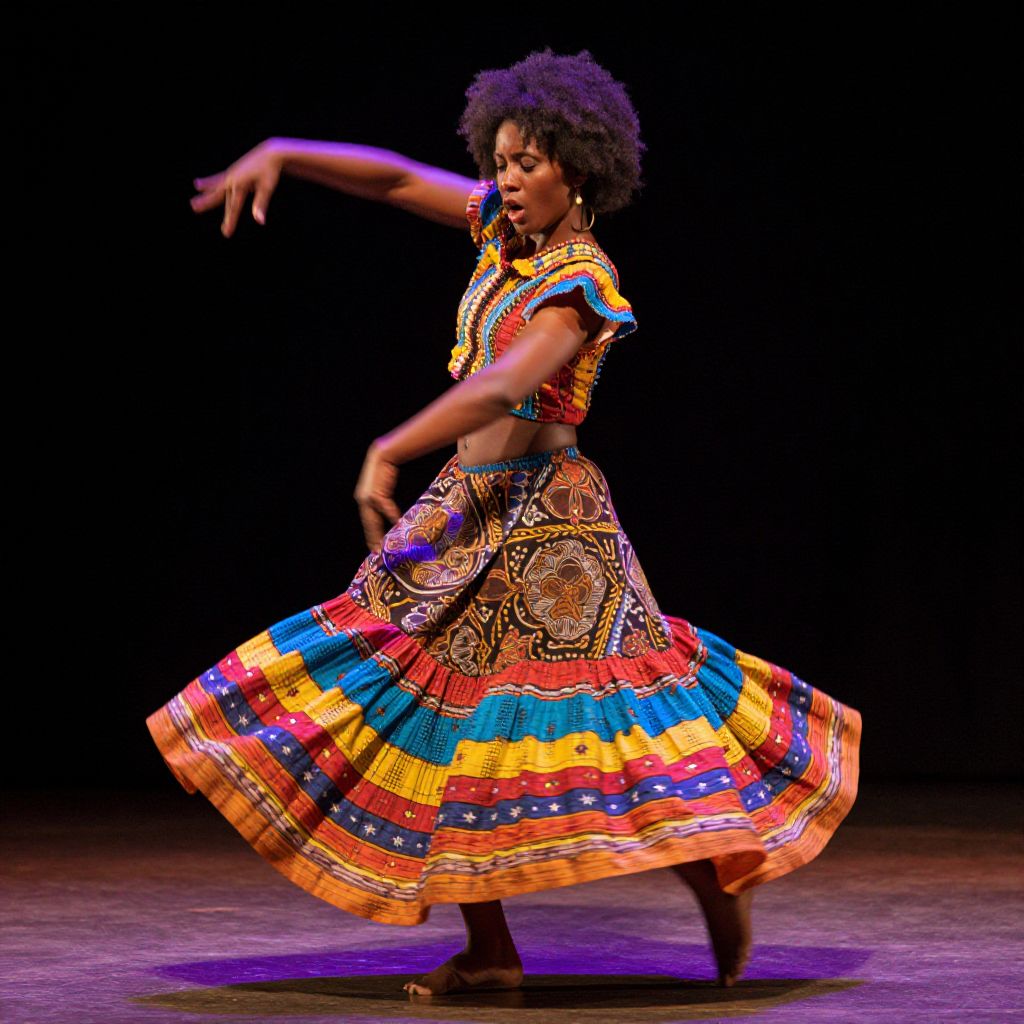 Afroamericana dancer performing an energetic, traditional cultural dance on a stage with dramatic lighting, flowing colorful costume, dynamic motion blur capturing movement, dark background emphasizing the dancer, vivid colors, intense focus on expression.