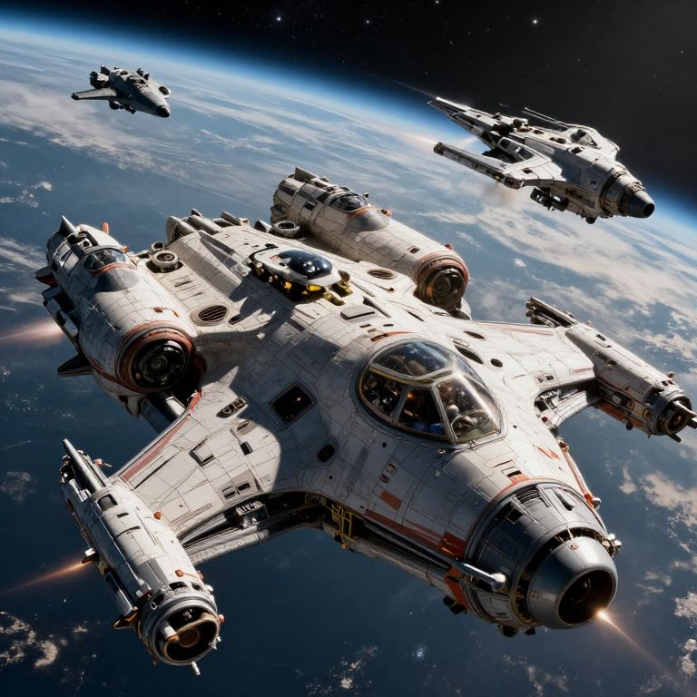 A highly detailed, photorealistic space battle scene with intricate surface details, featuring multiple spacecraft engaged in combat amidst a dramatic, cinematic atmosphere.