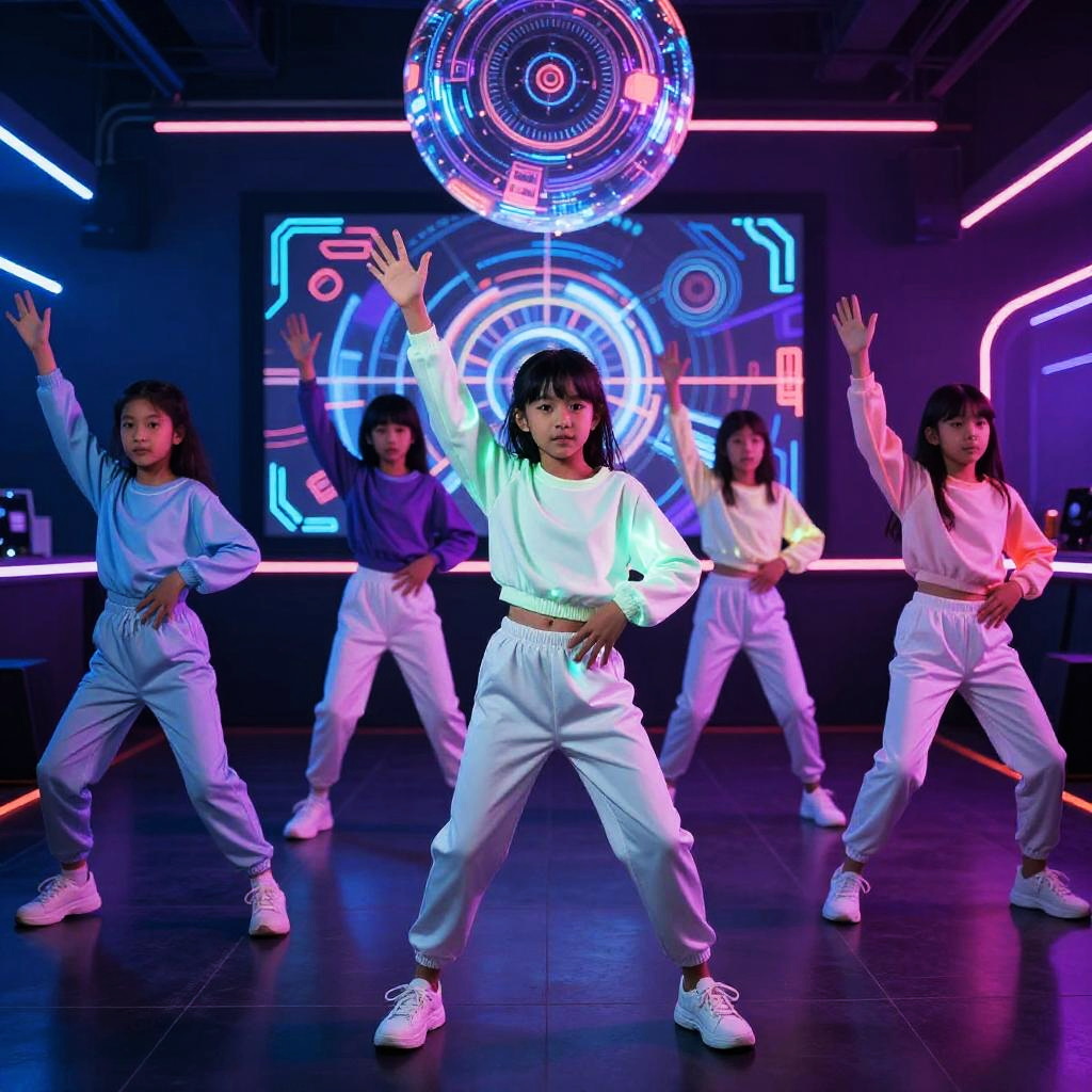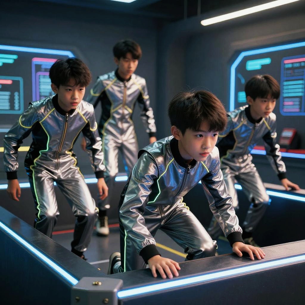 A digital CGI image depicting four young Asian boys with black hair, dressed in shiny, silver and black tracksuits with neon accents, in a futuristic, dimly lit room. They are positioned on a glowing, horizontal blue neon bar, leaning forward with focused expressions. The background features dark walls with illuminated control panels and screens, creating a sci-fi atmosphere. The boys' tracksuits reflect the room's lights, adding a metallic sheen. The image has a vibrant, high-contrast color palette, emphasizing the neon elements and the boys' intense expressions.