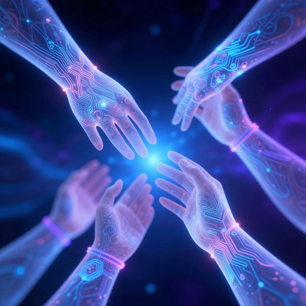 AI generated art hands, surreal and intricate, glowing circuit patterns embedded beneath translucent skin, elegant gestures floating in a cosmic digital space, vibrant neon blues and purples, hyper-detailed close-up, futuristic and ethereal atmosphere
