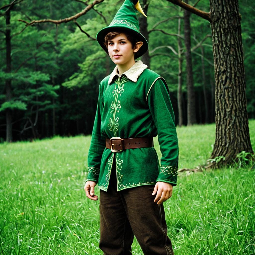 Full-body portrait of a young woman wearing a green elf princess costume with white trim, a matching green pointed hat, and brown leather boots. She has long brown hair styled in twin braids and wears a wide brown belt around her waist. The model has pointed elf ears and stands against a plain brown background.
