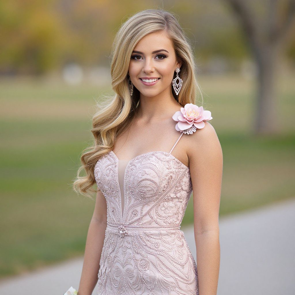 Fancy homecoming dress, 1girl, solo, dress, long hair, breasts, blonde hair, jewelry, earrings, smile, bare shoulders, flower, looking at viewer, cleavage, strapless, brown eyes, medium breasts, pink dress, blurry
