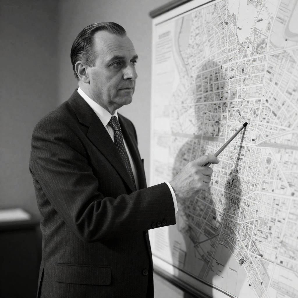 Black-and-white photograph of a middle-aged man with short, slicked-back hair, wearing a pinstripe suit, white shirt, and patterned tie. He stands to the left, holding a pointer in his right hand, pointing at a large map on the right. Map has detailed city street layout with intersecting lines. Man's expression is serious, focused. Background is blurred, focusing on man and map.