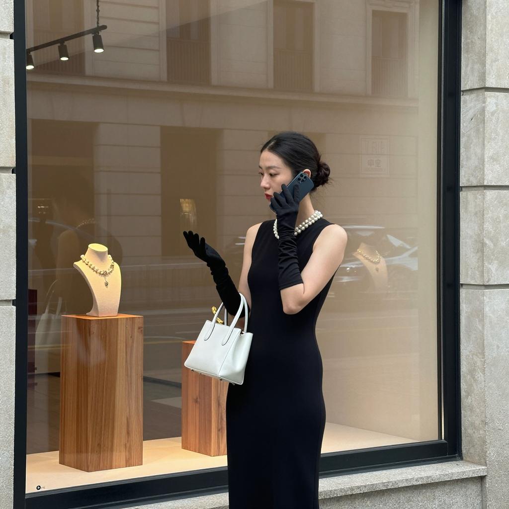 Elegant woman with an updo hairstyle wearing a black sleeveless dress, black gloves, and a pearl necklace, standing outside a jewelry store window. She holds a white handbag and a smartphone to her ear, engaged in a phone conversation. The store window displays jewelry on wooden stands, with reflections of urban buildings in the glass.