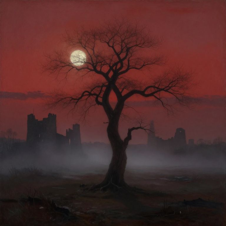 A solitary, twisted tree stands in stark silhouette against a somber blood-red dusk sky, its gnarled branches enshrouded by tendrils of misty fog. In the background, ancient castle ruins stand abandoned under an ethereal moonlit glow, casting elongated shadows across the desolate landscape. This haunting oil painting melds the dark romanticism of landscapes with the melancholic isolation of solitary figures, evoking a profound sense of nostalgia and solitude that resonates through the eerie scene.