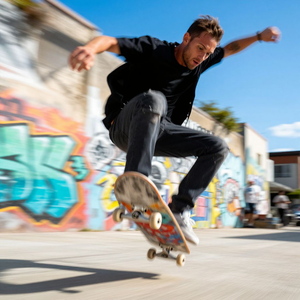 Skateboarder soaring through a sun-kissed urban landscape, wheels spinning in mid-air, blurred background, bright graffiti-covered walls, dynamic perspective, vivid hues, motion blur effect, capturing the thrill and freedom of this exhilarating moment. Man has masculine face and piercing eyes