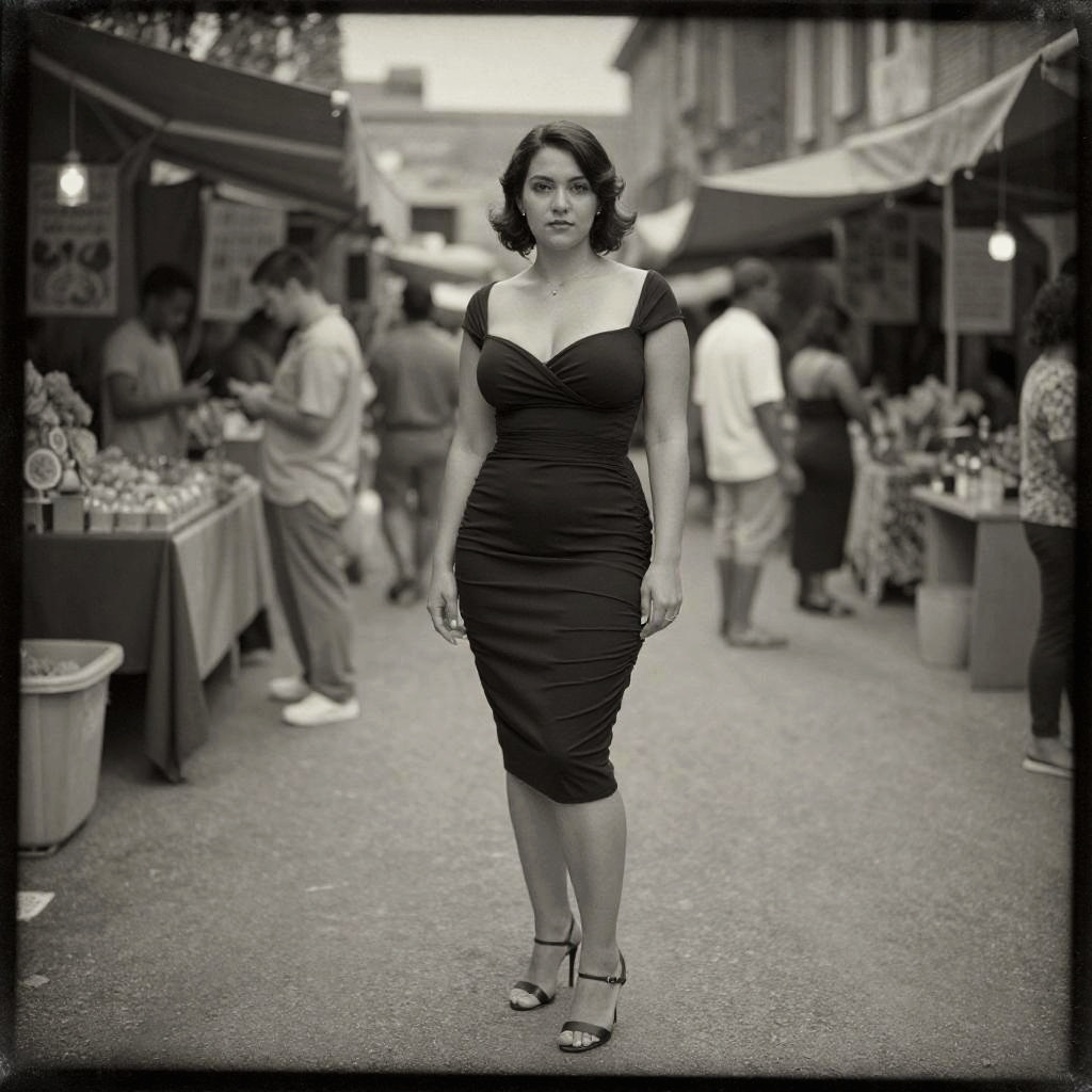 Black-and-white photograph of a confident woman with medium-length, wavy dark hair, wearing an off-the-shoulder, form-fitting black dress that accentuates her curvy figure, and black high-heeled sandals. She stands in the center of a bustling outdoor market, with blurred vendors and shoppers in the background. Market stalls on both sides display various goods, and overhead strings with small lights add to the market atmosphere. The woman's expression is poised, and she gazes directly at the camera. The image has a vintage, slightly grainy texture.