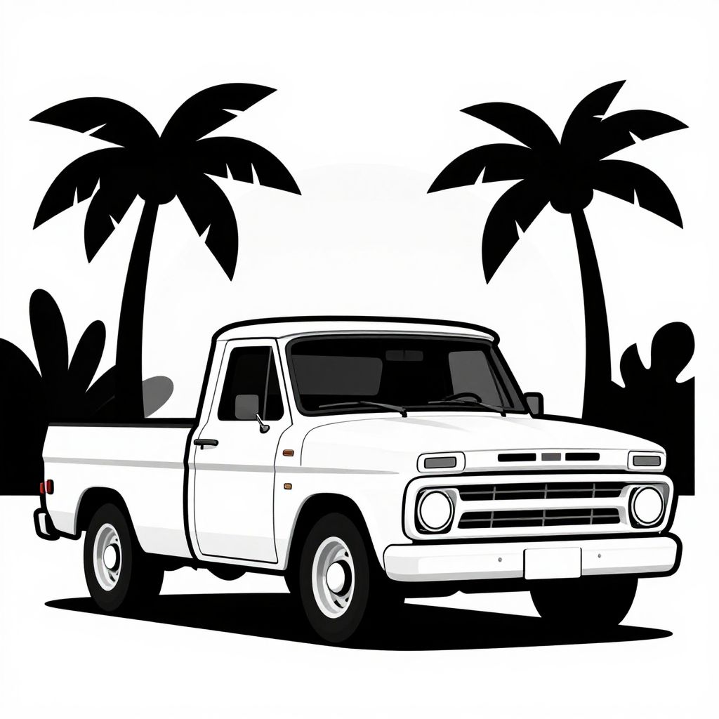 Black-and-white digital illustration of a classic pickup truck with two palm trees in the background, using bold, high-contrast silhouettes.