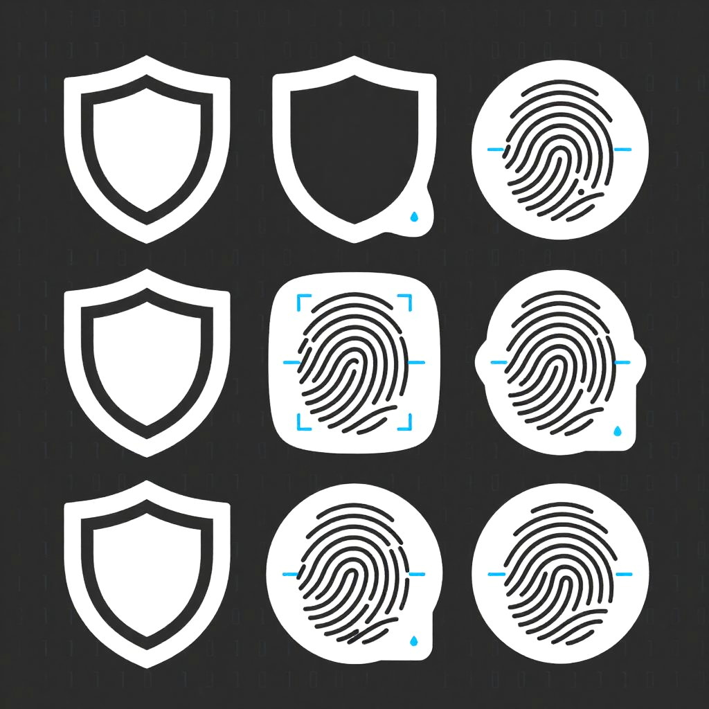 Cybersecurity stickers with minimalistic design featuring shield icons, fingerprint scans, and binary code patterns, clean lines, and a monochrome palette with blue accents.