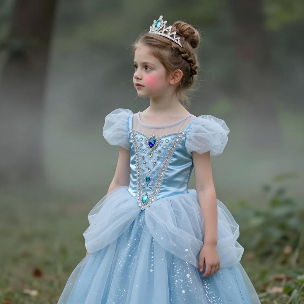 Kids photography, young girl wearing an crystal-embellished princess ball gown with puff sleeves, layered skirt and ornate jeweled bodice, plus a delicate silver tiara on her head, in powder blue tulle with white pearls and crystal accents on young girl with neutral skin tone and delicate features, hair up in a bun posed walking slowly through the forest, one hand lifting her skirt in enchanted woodland clearing under pale, silvery light that enhances the icy blue of the dress, dreamy fairytale portrait, high resolution, ultra-detailed, whimsical yet realistic fantasy photography