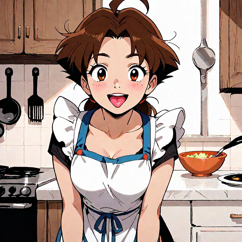 Source_anime, rating_explicit, score_9, score_8_up, flat colors, anime screenshot, anime screencap, deliaketchum, brown hair, brown eyes, parted bangs, ahoge, ponytail, low ponytail, medium breasts, looking at viewer, smile, open mouth, kitchen, apron, short sleeves, indoors