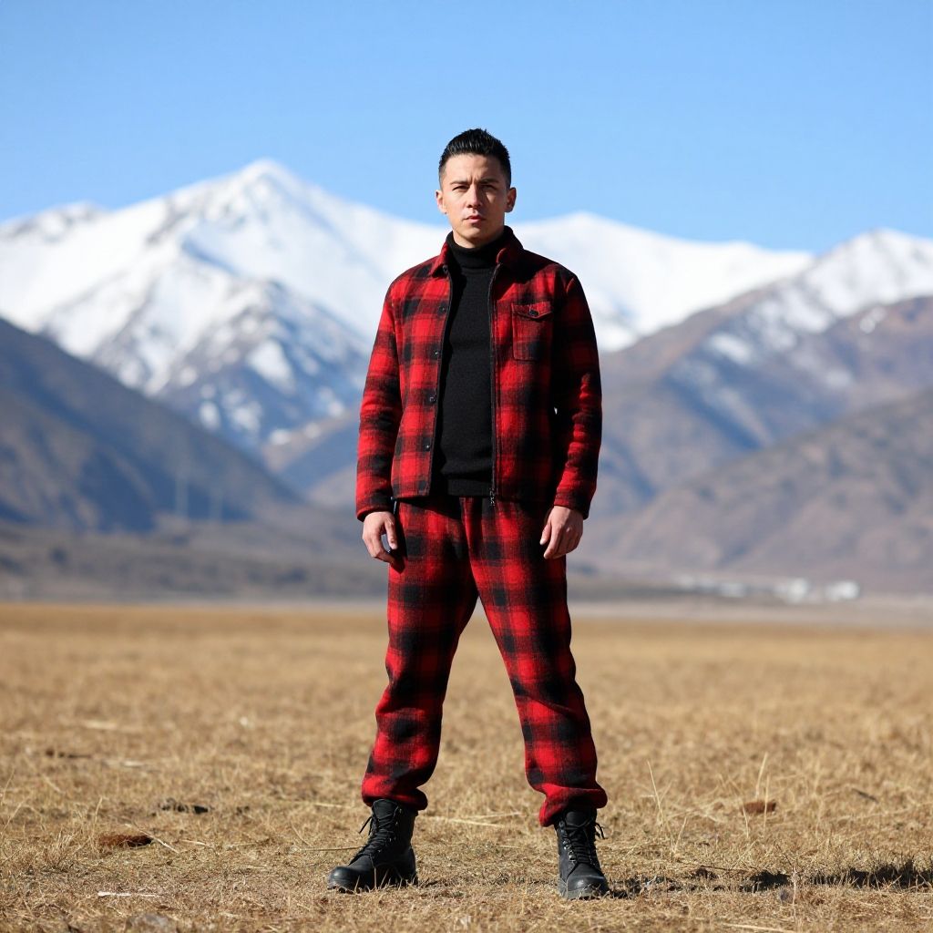 A man stands confidently in a vast open field, with snow-capped mountains in the background. He is dressed in a red and black plaid outfit, complementing the rugged and natural setting under a clear blue sky.
