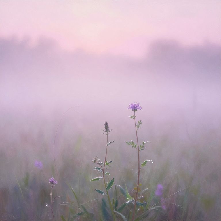 A photograph captures a serene, misty meadow at dawn. In the foreground, delicate purple wildflowers with slender green stems and small leaves stand tall. The background is softly blurred, creating a dreamy, ethereal effect with a gradient of pale pink and white hues. The mist adds a gentle, almost magical atmosphere to the scene. The overall color palette is soft and pastel, emphasizing the delicate beauty of the wildflowers against the misty, morning light. The photograph has a shallow depth of field, focusing on the flowers while the background remains softly out of focus.