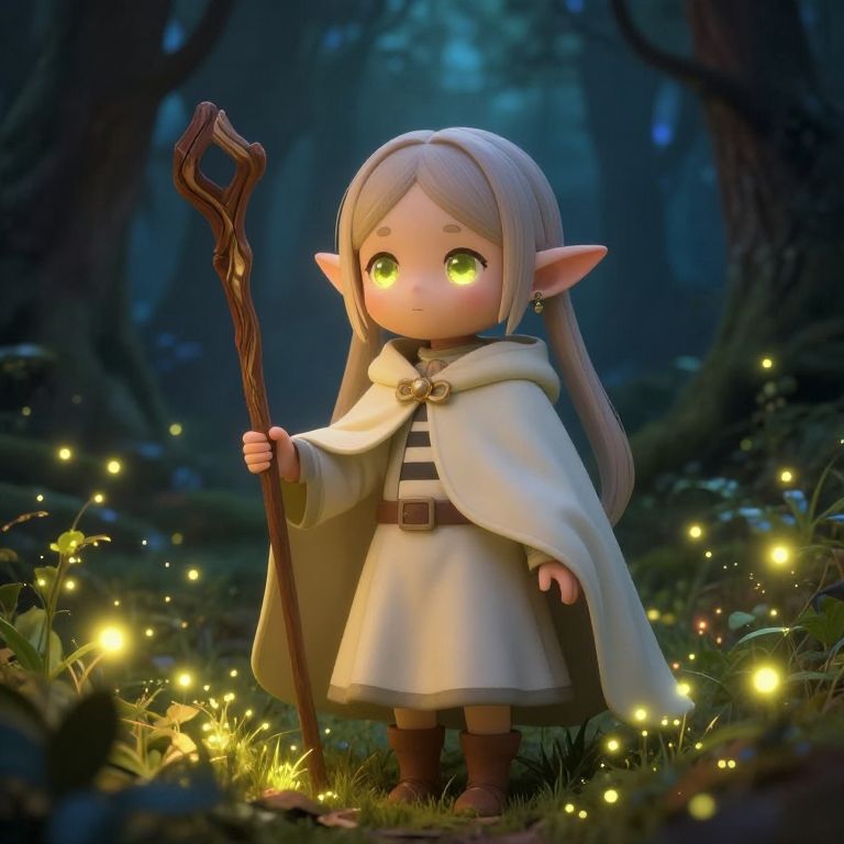 A digital CGI image of a cute, young elf standing in a mystical forest at night. The elf has large, glowing green eyes, long silver hair, and pointed ears. She wears a white cloak over a beige dress with black stripes and brown boots. She holds a twisted wooden staff in her right hand. The forest background is dark with tall trees and soft blue light filtering through. Small, glowing fireflies surround her on the grassy forest floor, adding a magical atmosphere. The elf's expression is gentle and curious.