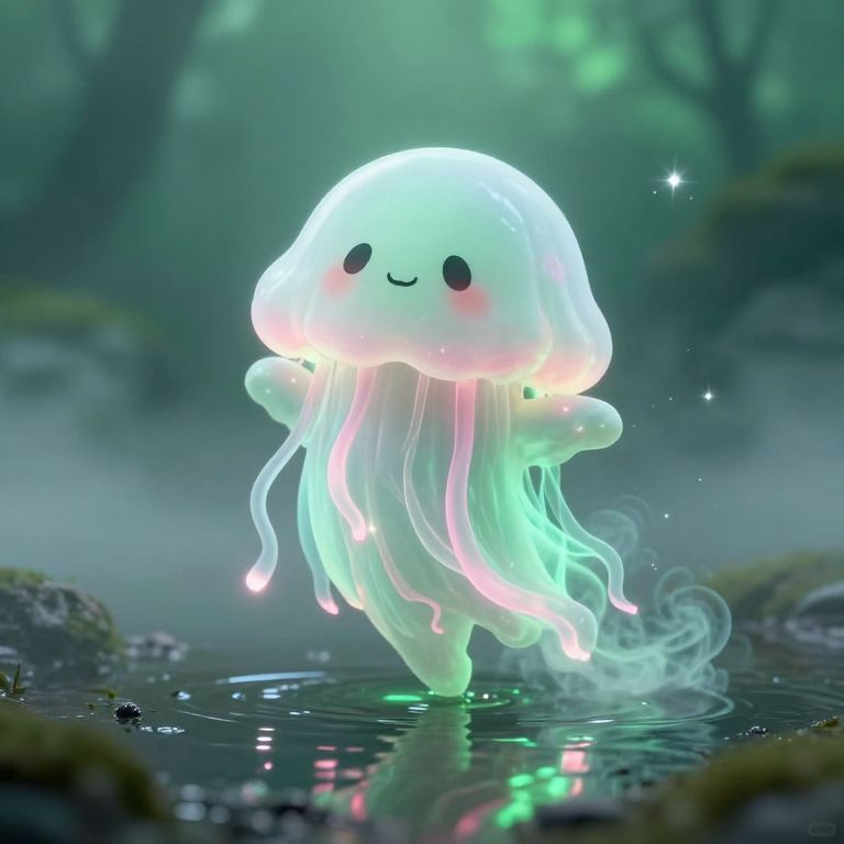 Digital artwork of a cute, glowing jellyfish with a smiling face, small black eyes, and blushing cheeks. It has a translucent white body with flowing, luminescent pink and green tentacles. The jellyfish stands in a shallow, reflective pond surrounded by a misty, forested background with blurred greenery and rocks. The light from the jellyfish creates a magical, ethereal atmosphere, with sparkles and soft light reflections on the water's surface. The overall style is whimsical and enchanting, with a gentle, dreamy aesthetic.