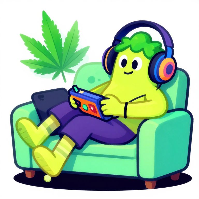 Weed images cartoon illustration showing a chill cannabis leaf lounging on a couch, holding a music player with funky headphones, exaggerated caricature style, bright neon colors with a relaxed and cozy vibe