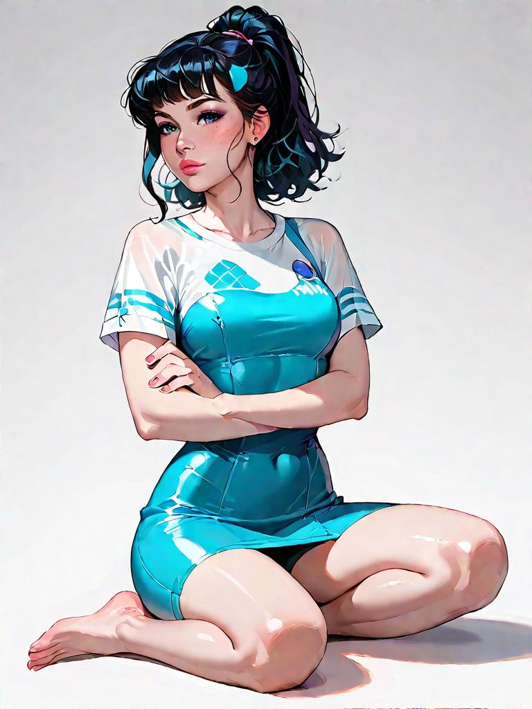 Digital illustration of a stylish woman with short black hair wearing oversized sunglasses, a turquoise sleeveless top with peplum waist detail, and a black fitted mini skirt. The woman is depicted in a full body shot with a realistic face, standing confidently against a light background with colorful geometric shapes.