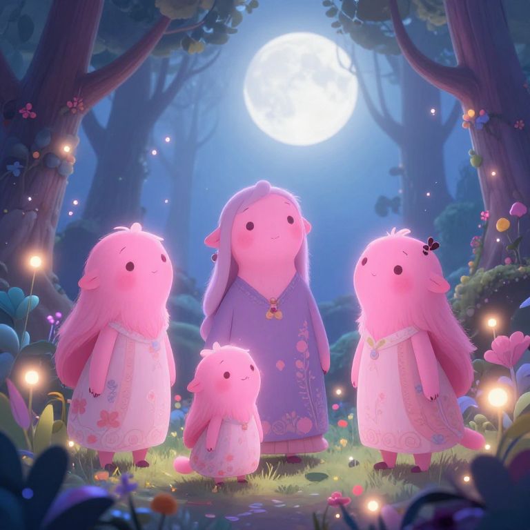 A whimsical digital illustration features five pink, fluffy, cartoon-like creatures with large black eyes, standing in a magical forest under a bright full moon. The central figure wears a purple robe with a yellow pendant, while the others wear white floral dresses. A smaller pink creature stands in front of the central figure. The forest is dimly lit with glowing fireflies, colorful flowers, and tall, dark trees in the background. The overall color palette includes soft pinks, purples, and blues, creating a dreamy, enchanting atmosphere. The style is cute and adorable, reminiscent of children's book illustrations.