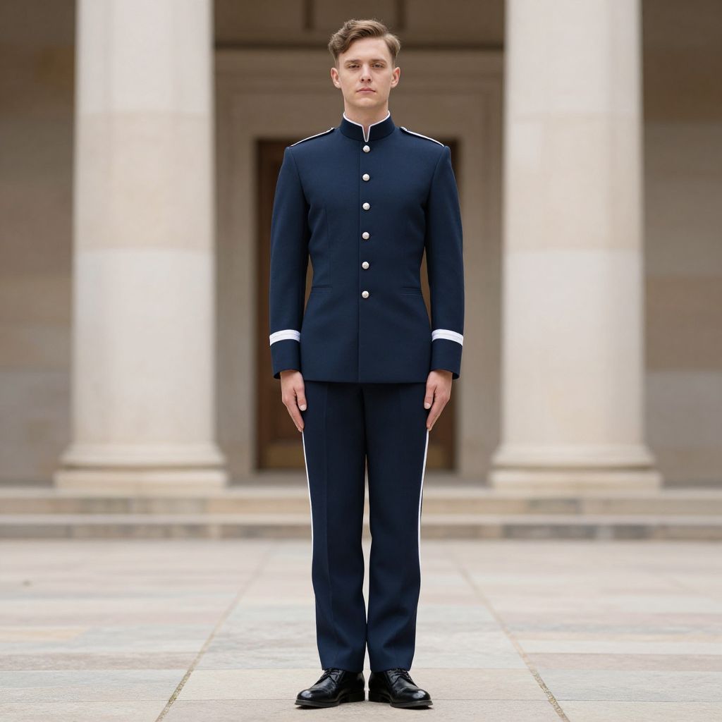 Navy Lyrical Costume, man in uniform standing in front of a building