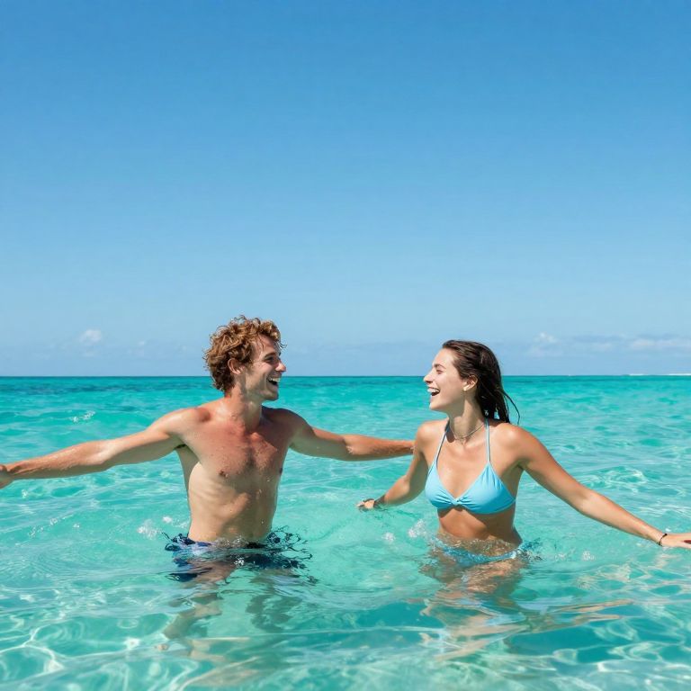 Photograph of a joyful couple in a clear, turquoise ocean under a bright blue sky. The man, with curly brown hair and a toned, shirtless upper body, extends his arms to the woman. She has long brown hair, a light blue bikini top, and an athletic build. Both are smiling, facing each other, and standing waist-deep in the water. The sunlight creates sparkling reflections on the water's surface, enhancing the vibrant colors. The horizon line is visible in the background, separating the ocean and sky. The image conveys a sense of happiness and carefree summer fun.