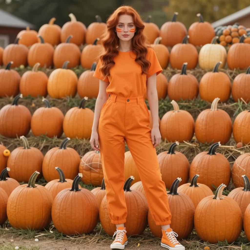 Woman in Red Dress with Halloween Jack-o'-Lanterns