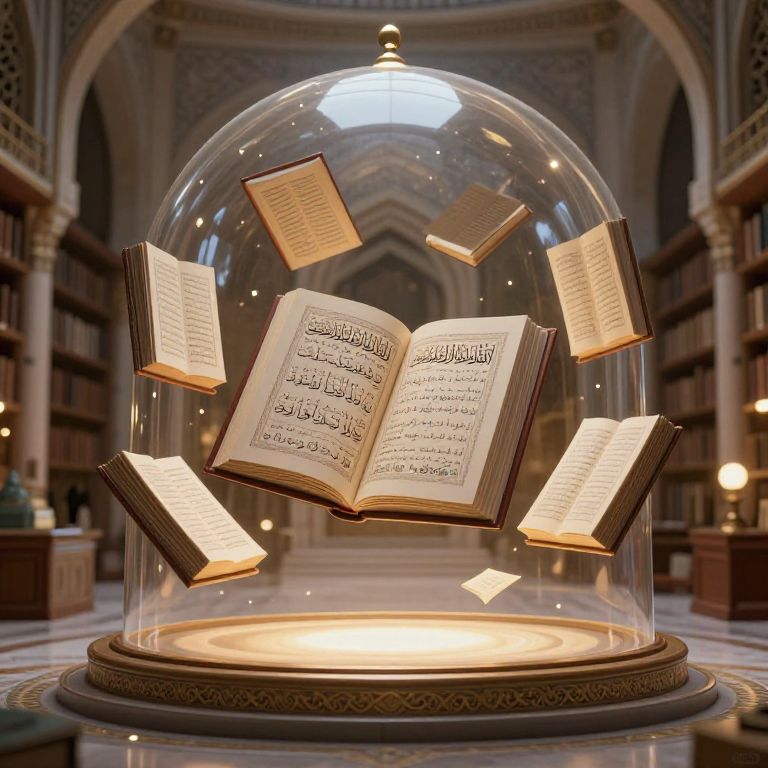 Islamic AI prompt: A futuristic Islamic library scene where AI-powered books float in a dome, their pages displaying dynamic calligraphy and mathematical equations, ambient light, serene and scholarly atmosphere, inspired by Muslim intellectual heritage.
