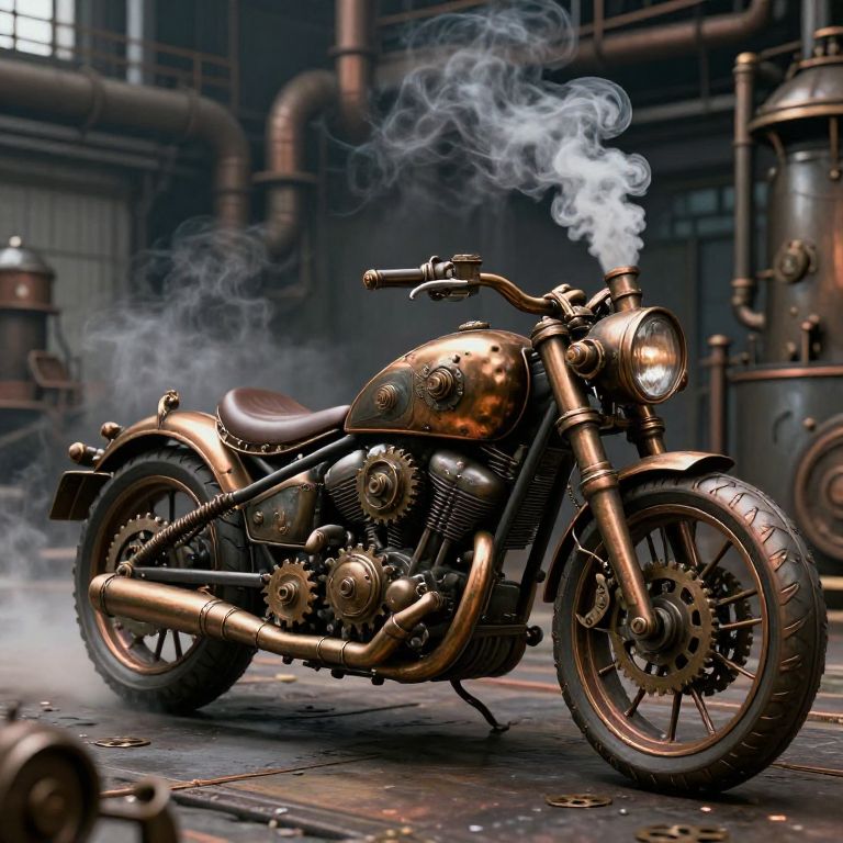 Photorealistic CGI of a bronze, vintage-style motorcycle with smoking exhaust, set in an industrial, steam-pipe-filled warehouse.