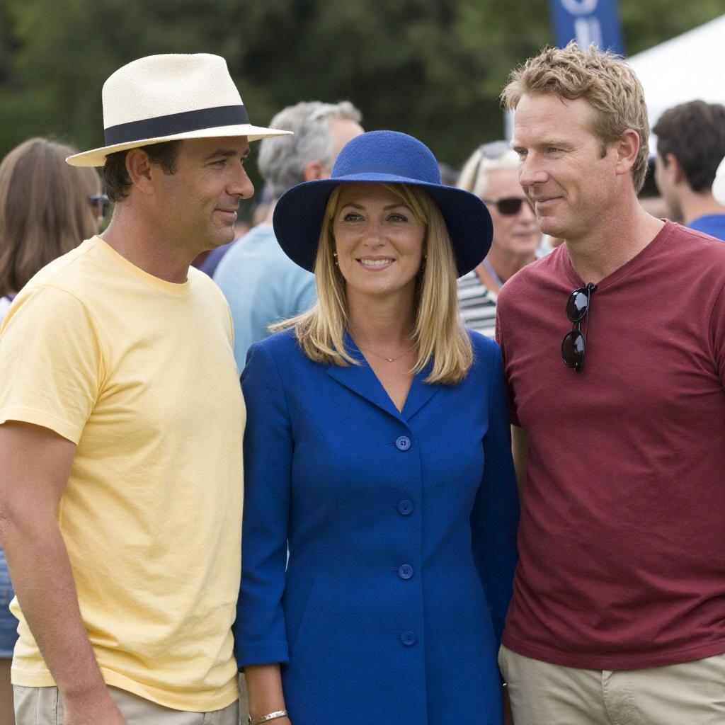 Photograph of three people at a crowded outdoor event. Central woman with blue coat and matching hat, smiling, flanked by man in yellow shirt and hat, and man in red shirt. Background includes other people and trees. Central woman has blonde hair, men have light hair. Man in yellow looks at central woman, man in red looks at central woman. Casual attire, summer setting.