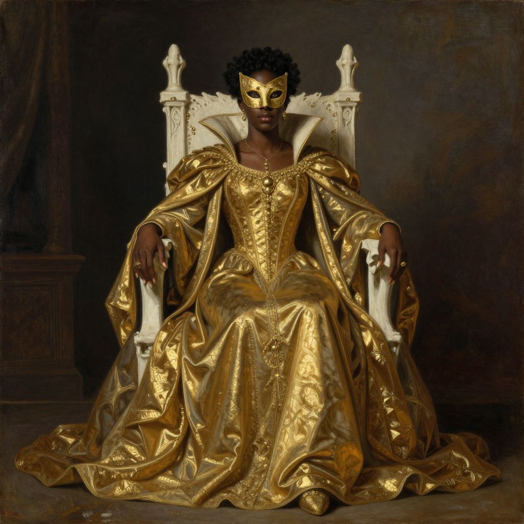 Masked Black Queen in Gold Gothic Robes