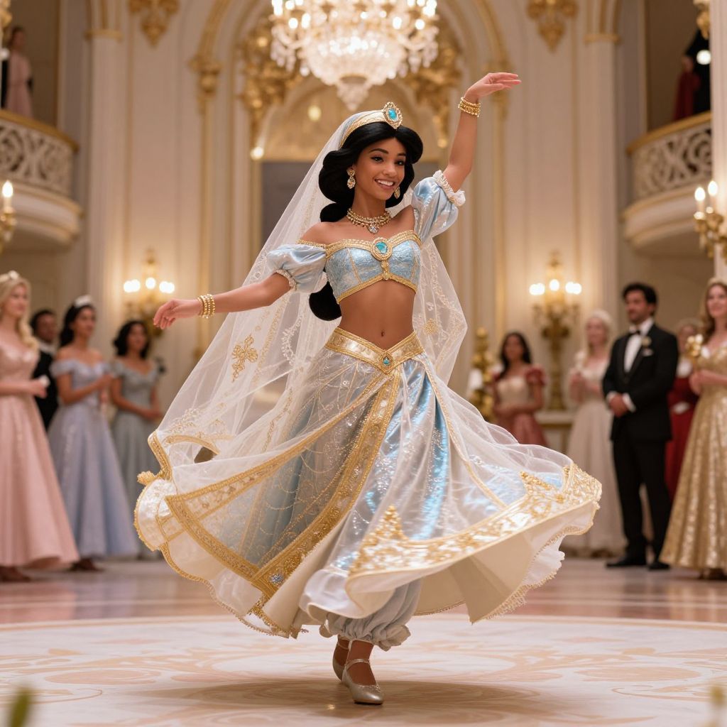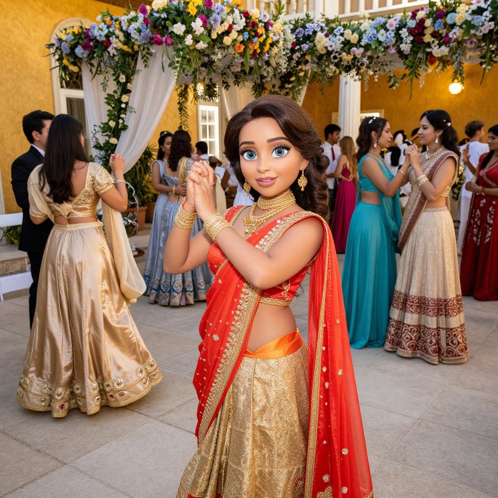 A festive wedding celebration in a golden-hued palace courtyard, where guests dressed in colorful frocks wedding party costume are dancing in pairs under a canopy of papal flowers, one woman with big, expressive eyes and warm brown skin wearing a bright red and gold saree-like frock, another with gentle blue eyes and long dark hair in a flowing silk frock, detailed fabrics and textures captured in natural light.. The woman has big tits and cute face