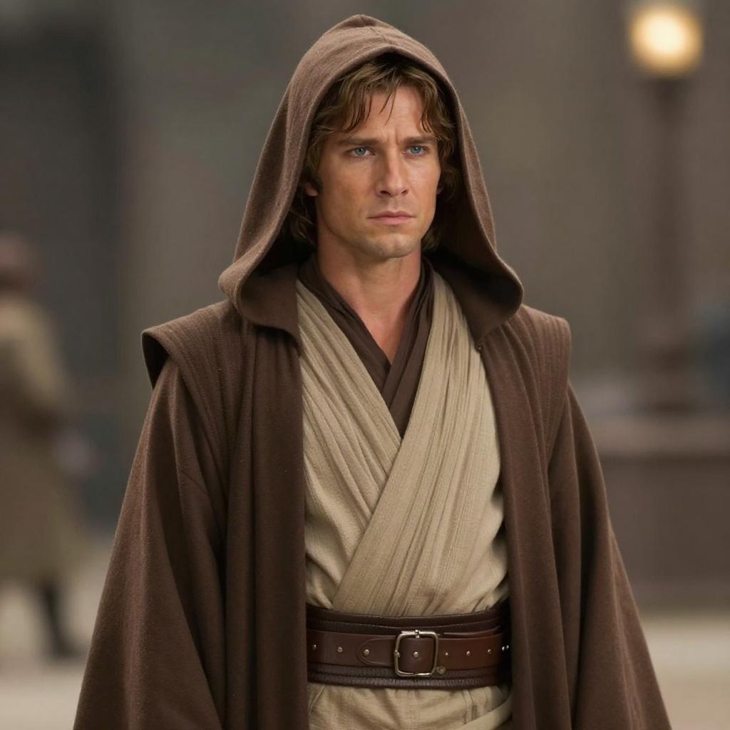 Photorealistic portrait of a young man wearing a hooded brown Jedi robe with a beige tunic and brown belt, inspired by Han Solo cosplay from Star Wars. The subject has short brown hair, blue eyes, and a clean-shaven face, standing with a serious expression against a blurred street-like background with warm, soft lighting.