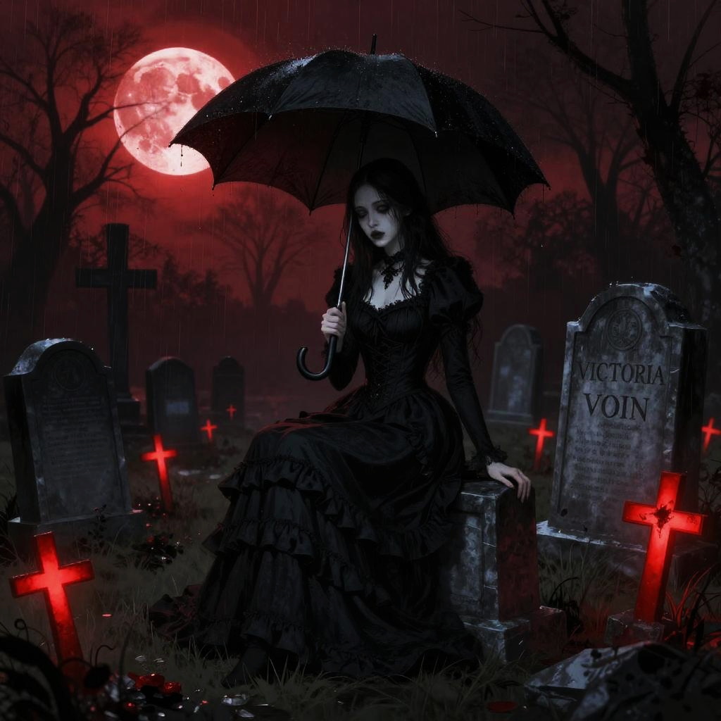 A gothic digital illustration featuring a pale, dark-haired woman in a black, ruffled dress, sitting on a gravestone labeled "VICTORIA VOIN." She holds a dripping black umbrella, surrounded by eerie, glowing red crosses and tombstones in a dark, rain-soaked cemetery. A red moon hangs ominously in the night sky, casting a blood-red hue over the scene.