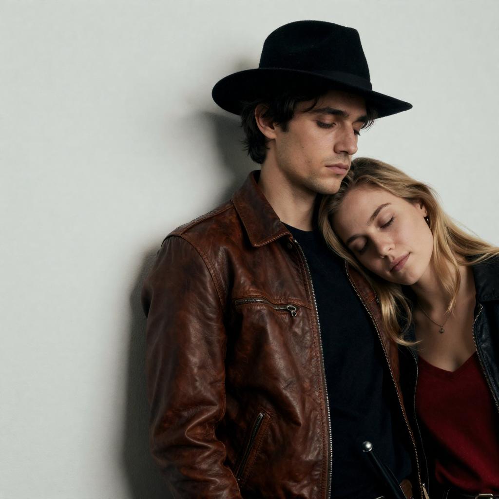 Photograph of a man and woman leaning against a white wall. The man, with dark hair and a black hat, wears a brown leather jacket and holds a black object. The blonde woman, with closed eyes, rests her head on his shoulder, wearing a red top. The image has a high-contrast, gritty style.