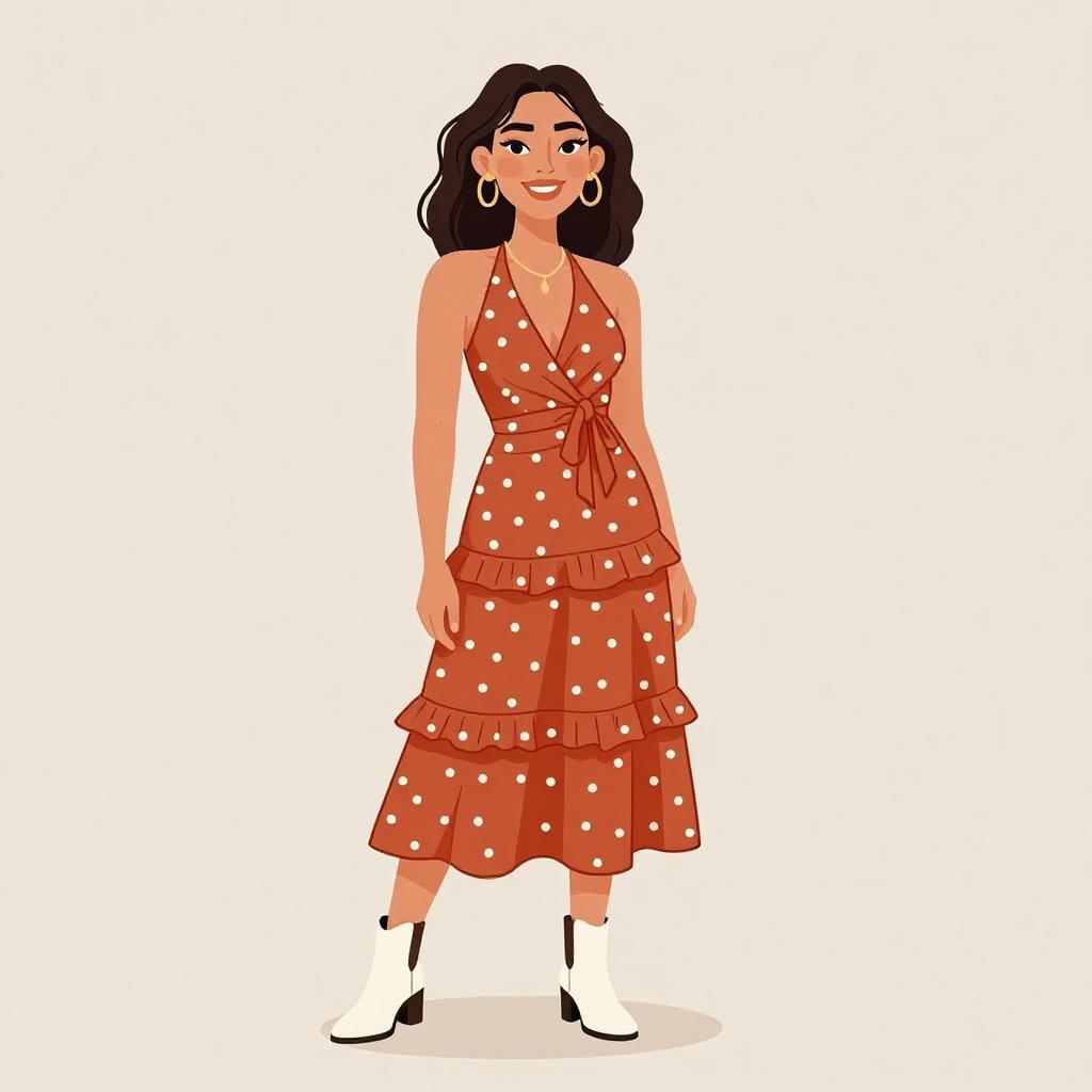 Digital illustration of a smiling woman with medium-length black hair, wearing an off-shoulder red dress adorned with white daisy-like flowers. She has hoop earrings and white strappy sandals. The background features a white wall with two large vases, one brown and one white, each containing dried grasses. The floor is light wood, adding a warm tone to the setting. The woman stands centered, exuding a casual, summer-ready vibe. The overall style is clean and vibrant, with a focus on simple, cheerful aesthetics.