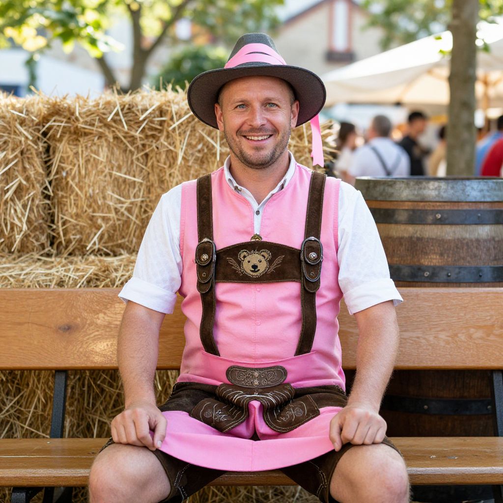 A well-lit, realistic photo of a man in a vibrant pink Bavarian costume, complete with a traditional leather apron, a wide hat with a pink ribbon, and a stitched-on bear face, sitting on a wooden bench in a Bavarian beer garden during a festival, the setting includes hay bales, a vintage beer barrel, and soft afternoon sun, his face is clear and friendly with a cheerful, open smile.
