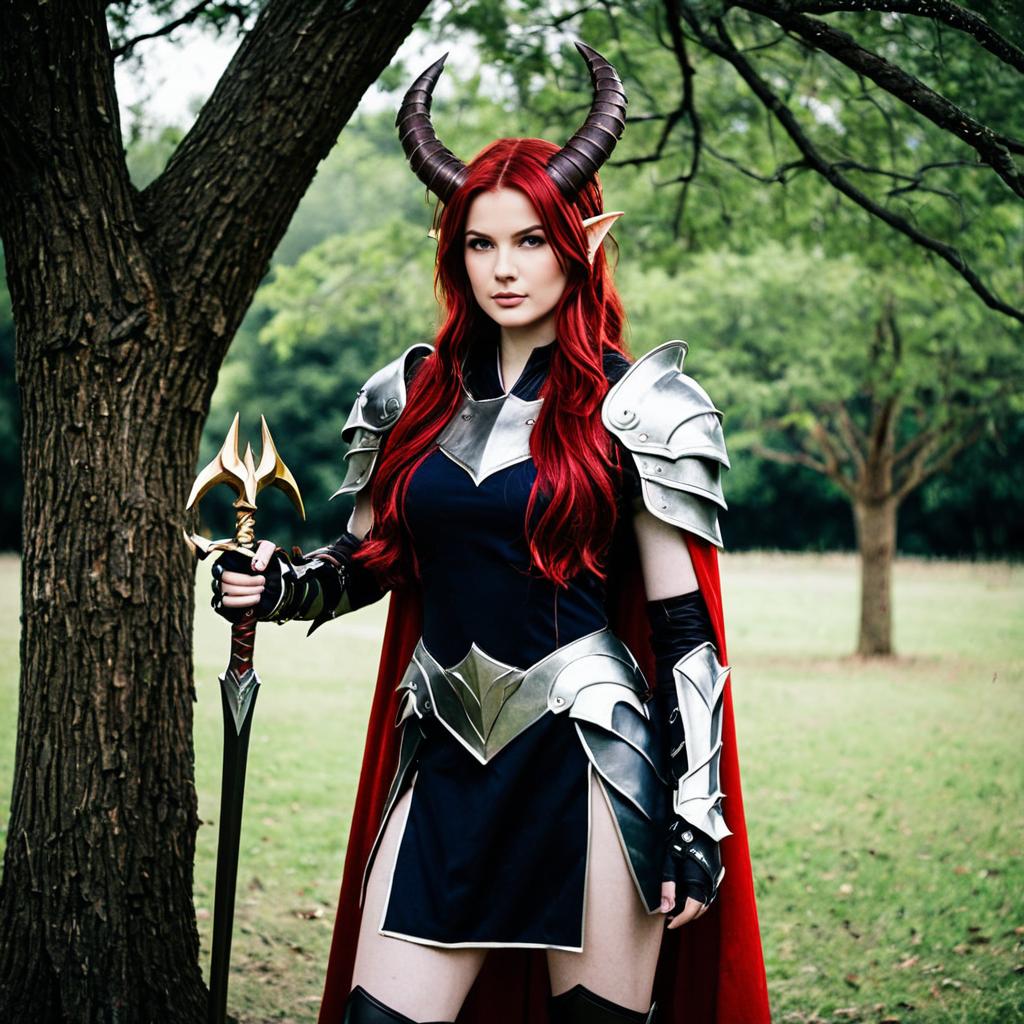 Aurora costume maleficent,1girl, horns, long hair, blonde hair, solo, blue eyes, green dress, realistic, tree, dress, lips, looking at viewer