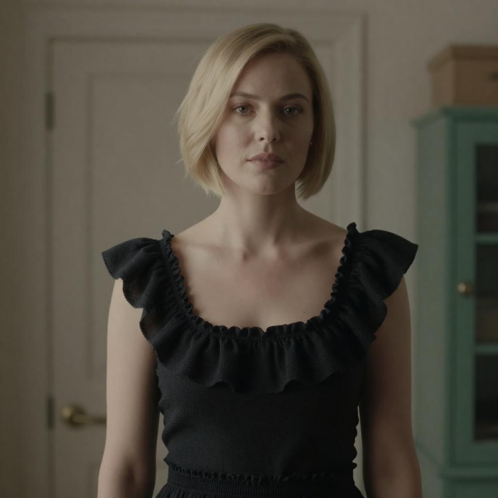 Photograph of a blonde woman with straight hair, blue sleeveless top, pink bra straps visible, arms crossed, standing in front of a maroon door with a white frame. She has a serious expression. Background includes a white curtain on the right.
