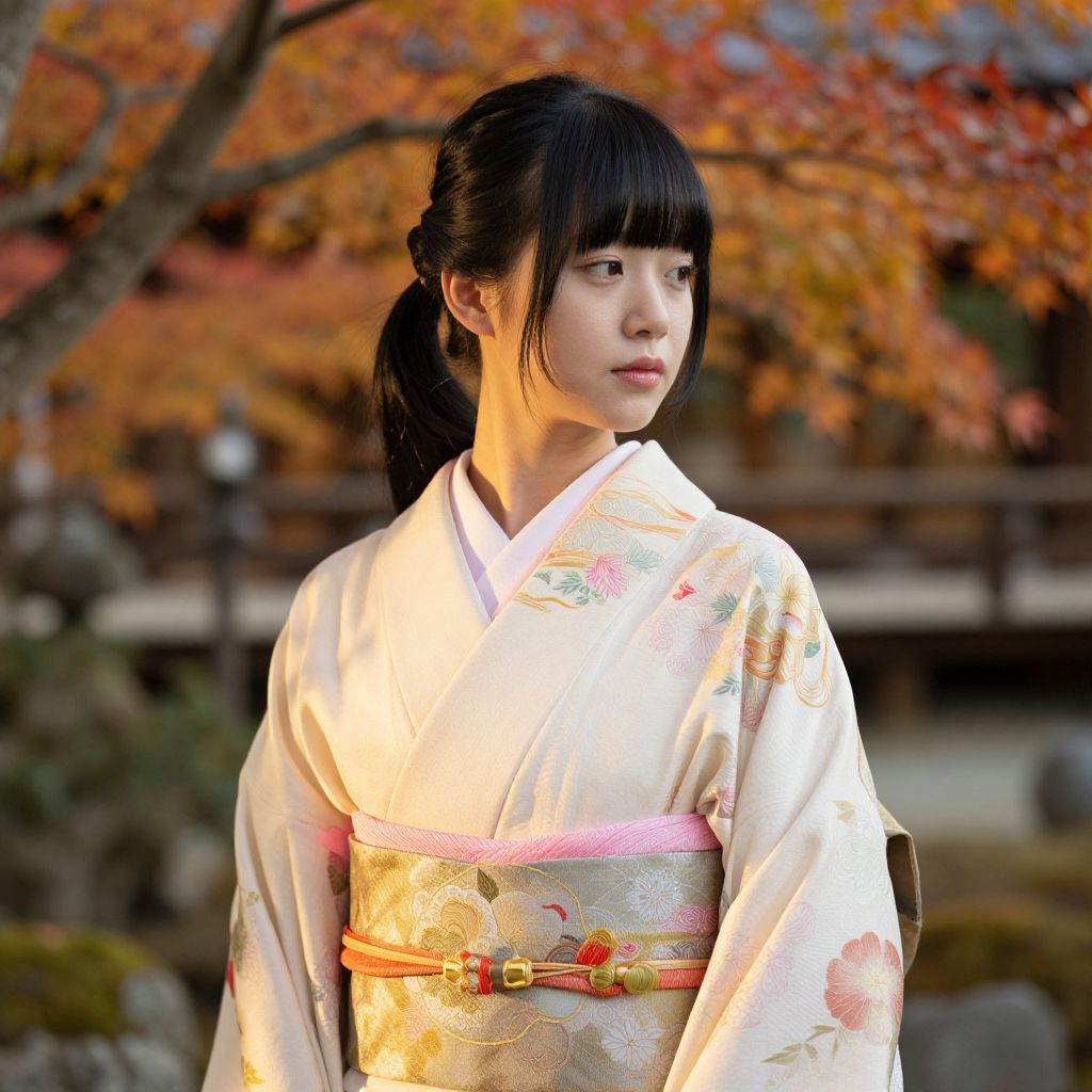 Photograph of a young Japanese woman with black hair in a ponytail, wearing a white floral kimono with pink obi, standing outdoors in autumn