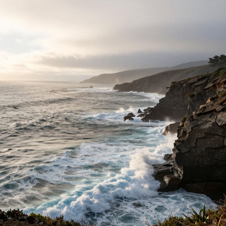 Ocean waves cascade against rugged cliffs as sunlight filters through misty clouds, creating a serene coastal landscape where nature's grandeur meets the boundless sea.
