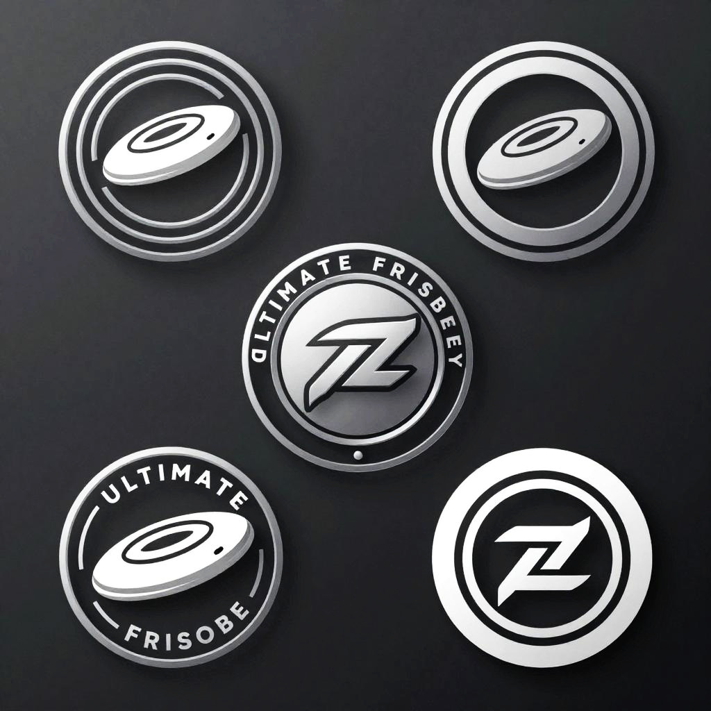 Ultimate frisbee logos incorporating flying discs and circular patterns, sleek futuristic aesthetics with metallic tones and clean typography suitable for competitive leagues