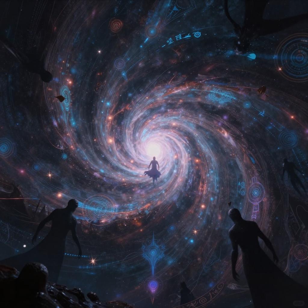 Digital art of a silhouetted figure flying through a swirling, luminous galaxy with cosmic patterns and glowing orbs, surrounded by dark, shadowy