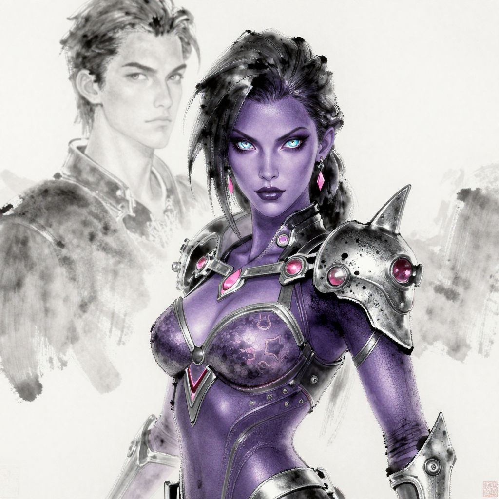 This digital illustration in a comic book style features a fierce, purple-skinned woman with glowing blue eyes as the central figure. She has black hair, styled in a wild manner, and wears a futuristic, armored suit with metallic shoulder guards adorned with pink gemstones. Her suit is form-fitting, accentuating her athletic physique and large breasts. In the background, a grayscale, semi-transparent sketch of a man with short, dark hair and a stern expression adds depth. The background is mostly white with black and gray splatters, focusing attention on the vibrant, detailed character. The overall effect is dynamic and otherworldly.