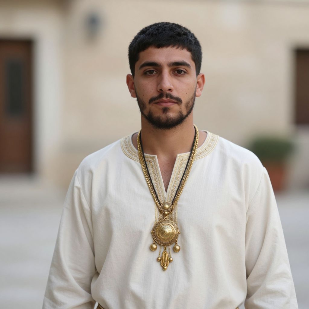 Photograph of a young Middle Eastern man with short, dark curly hair and a trimmed beard, standing outdoors against a blurred beige building background. He wears a white, long-sleeved, traditional tunic with a V-neck, adorned with intricate gold jewelry around his neck, featuring a large, circular pendant with dangling elements. His expression is neutral, with slightly parted lips and dark, focused eyes. The lighting is natural, highlighting the textures of his tunic and jewelry. The background includes out-of-focus windows and a potted plant.