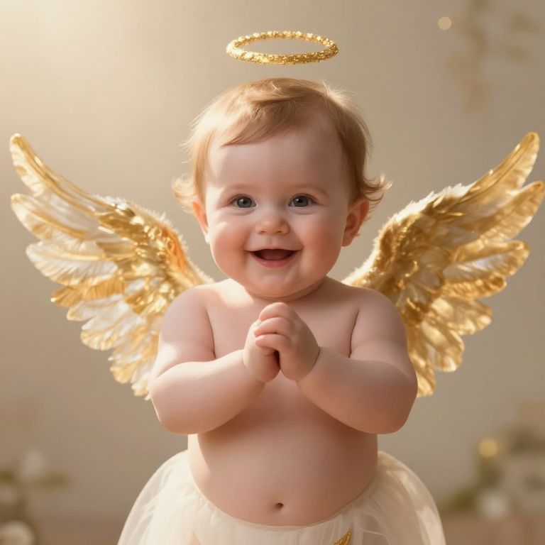 Photograph of a chubby, smiling baby with light skin and short, light brown hair. The baby, who is nude except for a translucent white diaper, has golden, feathery wings and a glowing golden halo above their head. Their small hands are clasped together in front of their chest. The background is softly lit with warm, beige tones and blurry, indistinct golden bokeh lights. The baby's joyful expression and angelic features create a serene, heavenly atmosphere.